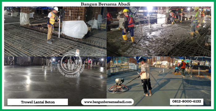 Bangun Bersama Abadi menyediakan layanan jasa trowel lantai beton profesional dengan tenaga berpengalaman dan juga peralatan modern. Setiap proyek dikerjakan dengan standar kualitas tinggi sehingga hasil akhir kuat, halus, dan presisi.
